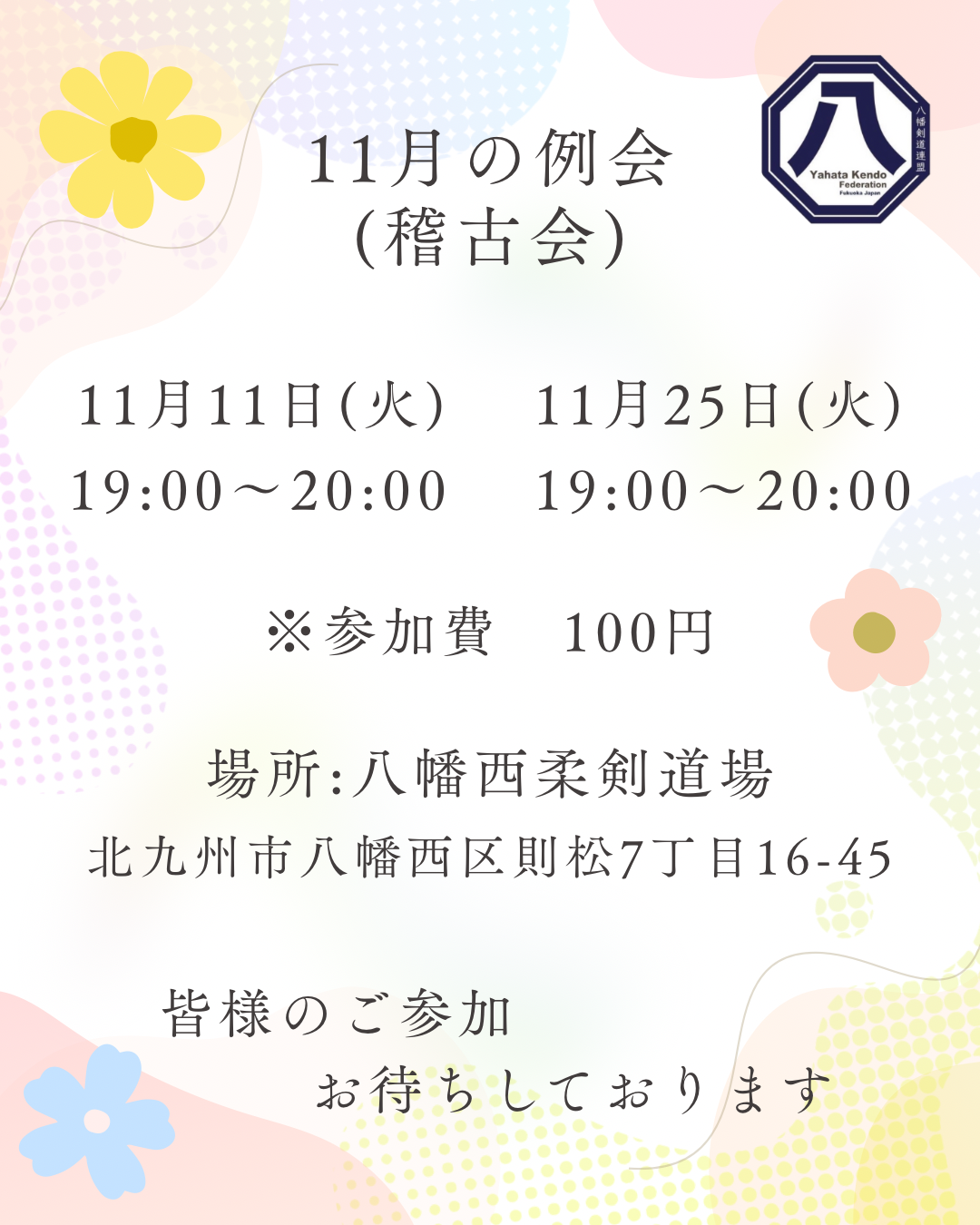 ★場所:八幡西柔剣道場(北九州市八幡西区則松7丁目16-45)